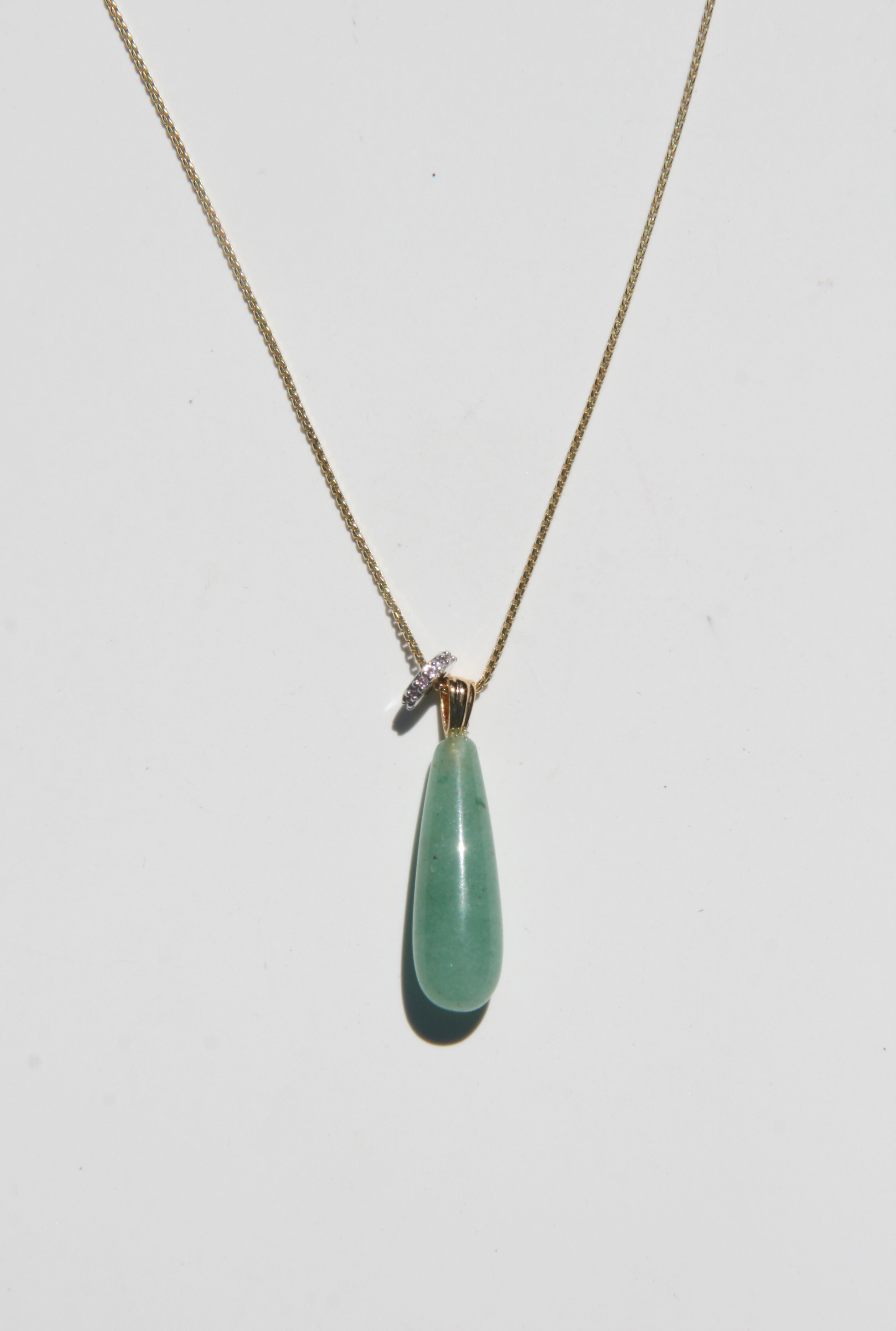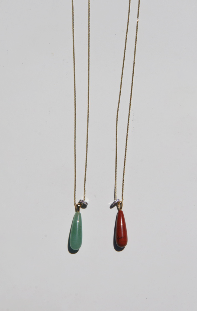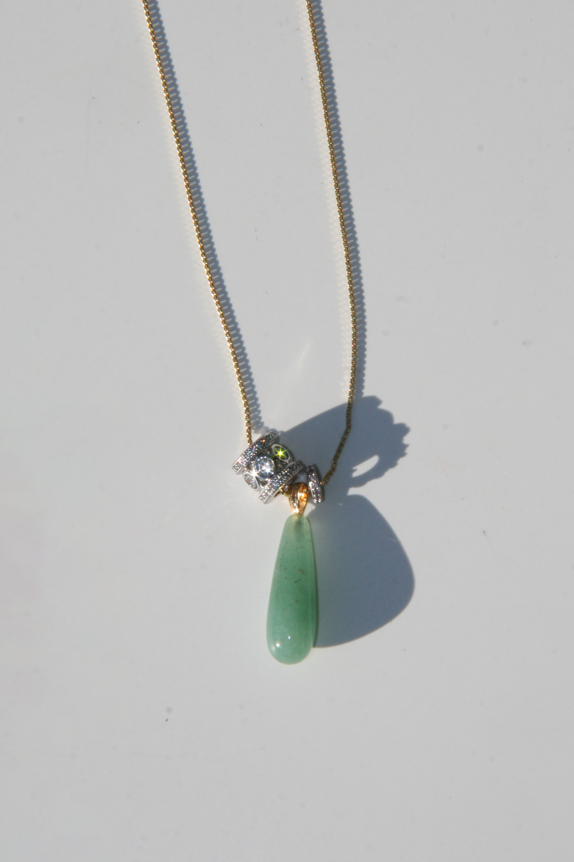 Sleek and elongated teardrop gemstone with a detailed grooved bail floats on a delicate box chain. Paired with a sparkling tiny pavé disc with the option to add an ornate zircon bead to create a vintage inspired heirloom cluster.