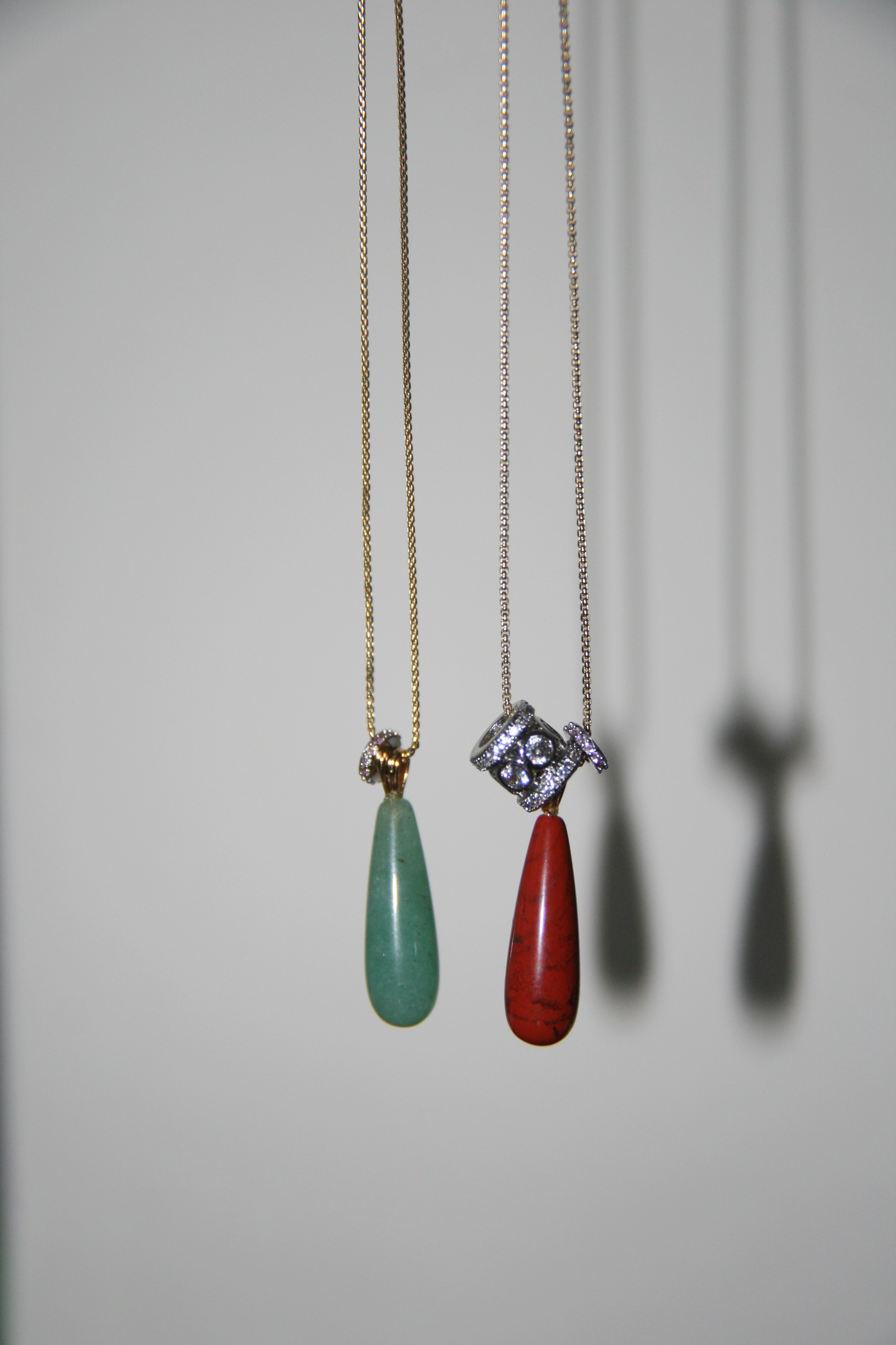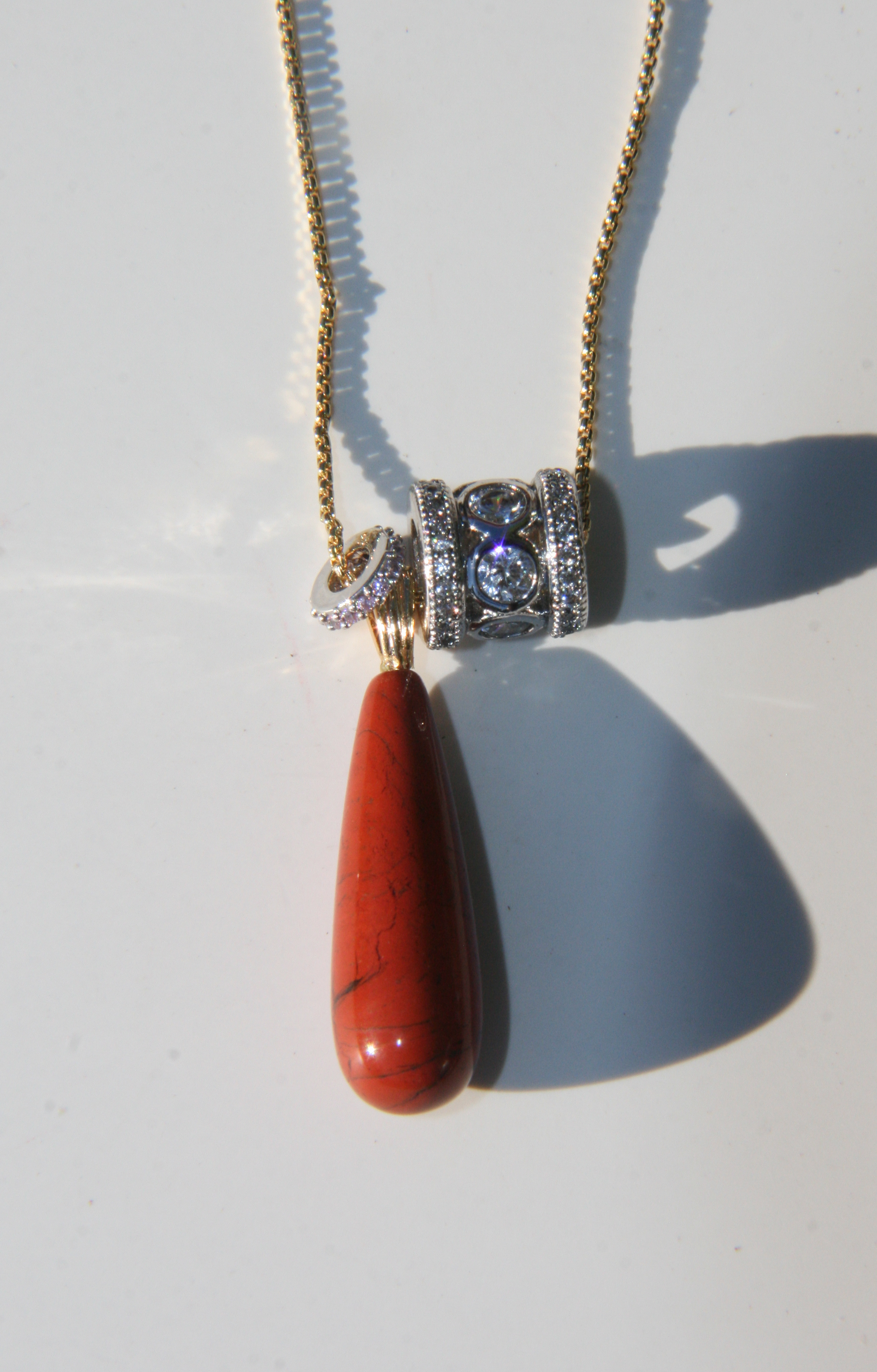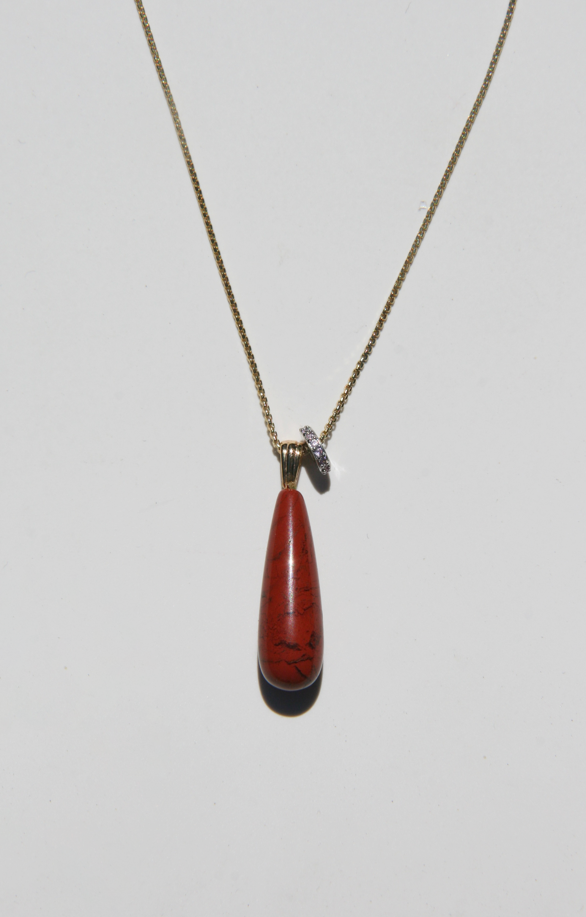 Sleek and elongated teardrop gemstone with a detailed grooved bail floats on a delicate box chain. Paired with a sparkling tiny pavé disc with the option to add an ornate zircon bead to create a vintage inspired heirloom cluster.