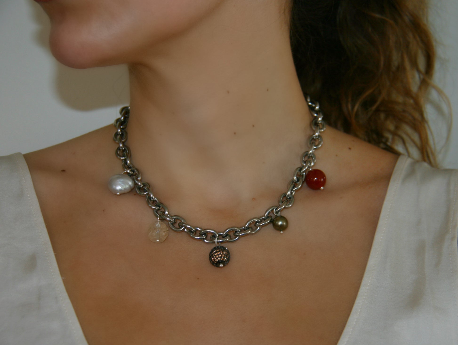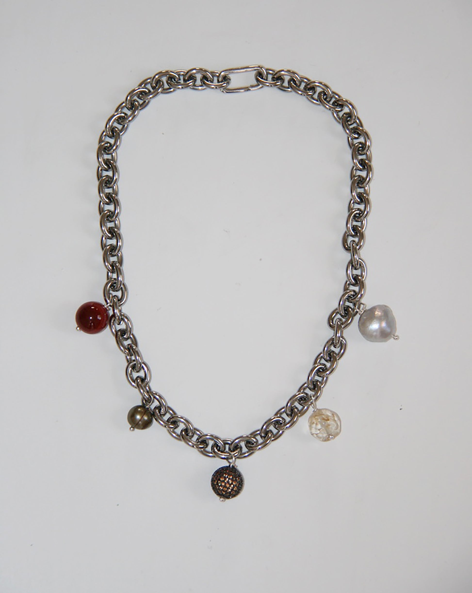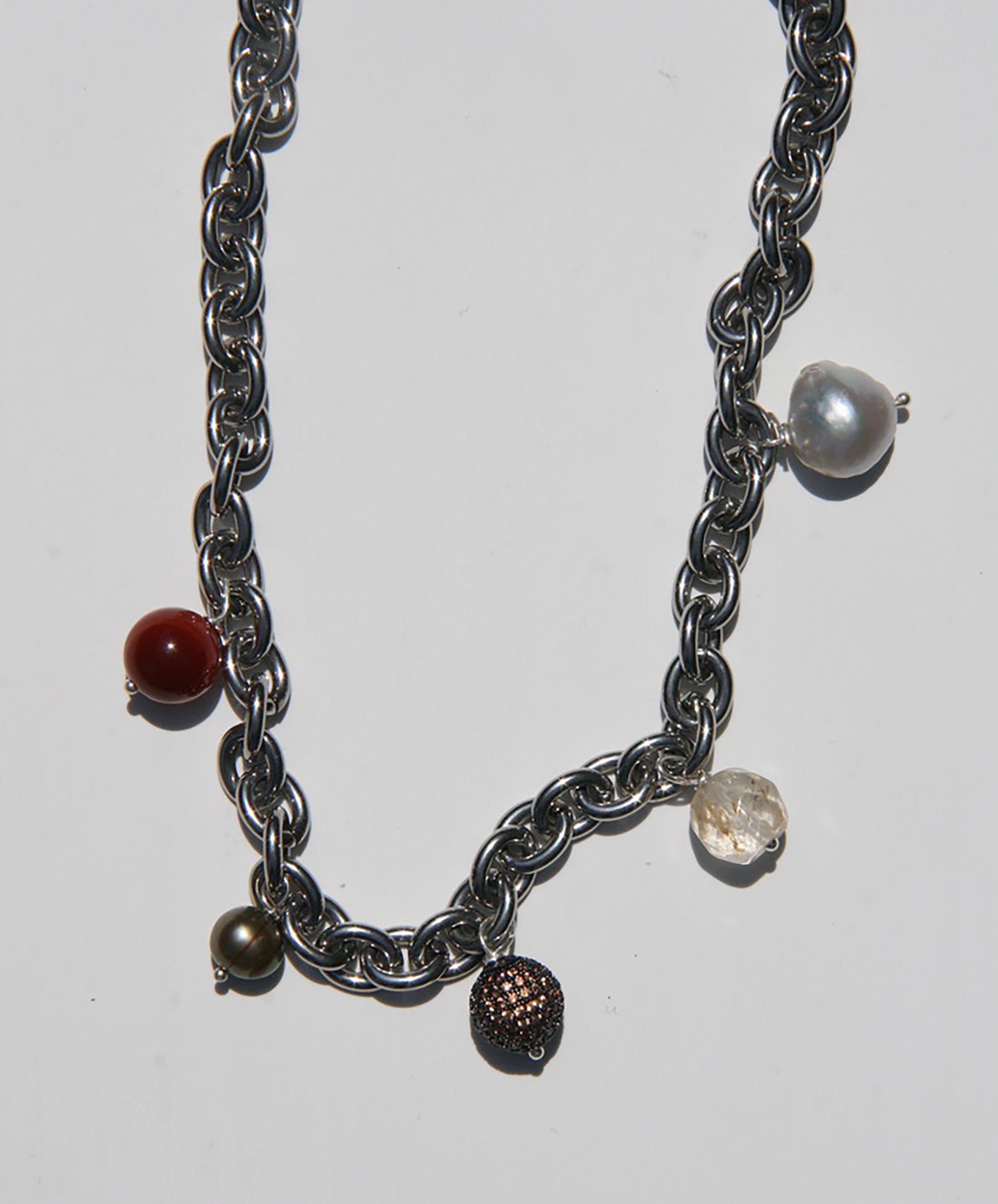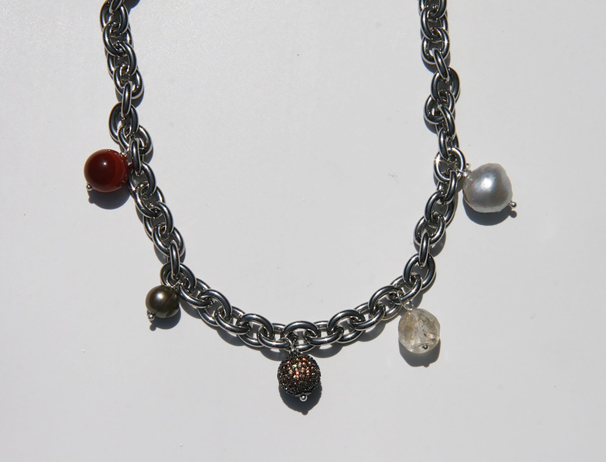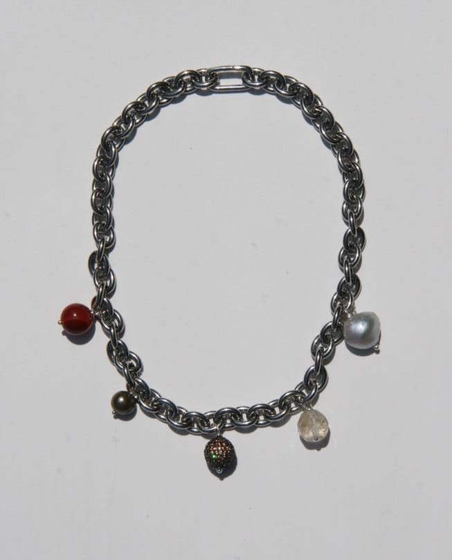 A carefully curated combination of gemstones in different shapes, colors, and textures meant to compliment one another. Each stone suspended on a high polish rhodium cable link chain, this necklace adds color and curiosity.