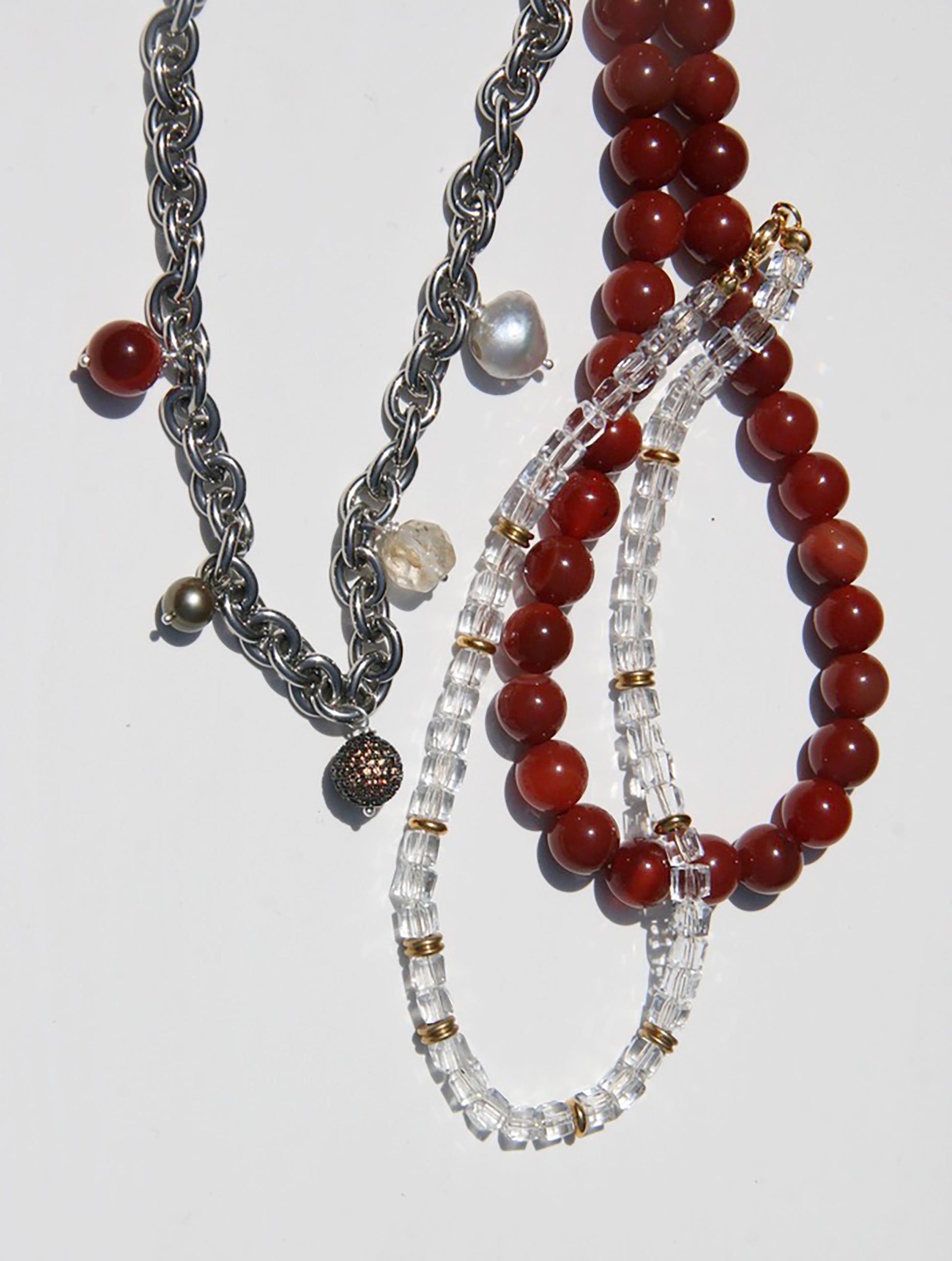 - Carnelian, Freshwater Pearl, Rutilated Quartz, Zircon